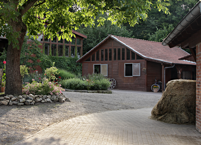 Empfangen werden Sie von einem arrondierten Arrangement aus Stallungen und der Reithalle. Pferde schauen aus ihren Boxen in den Hof mit seinem bäuerlichen Blumengarten, der mit vielen lauschigen Plätzen zum Verweilen einlädt.