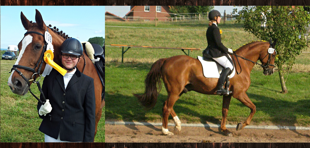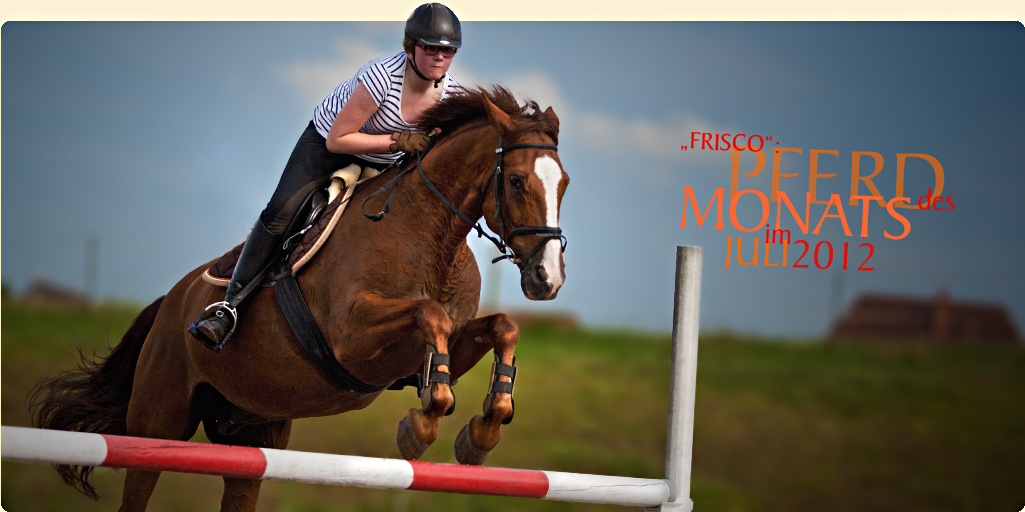 Springen immer, Kutschen nimmer! Ist die Stange nicht etwas hoch? Kyra Wiegand-Behmann blickt während der Vorbereitungen für die Foto-Aufnahmen mit etwas Sorge auf das Hindernis. "Nein, sonst springt er nicht gut!" Henriette, ihre Tochter, ist sich da sicher und reitet Frisco für den ersten Sprung schon mal warm. Gelegenheit genug, um die Stange doch ein wenig niedriger zu stellen - nur ein wenig. Doch schon die ersten Sprünge zeigen, was Frisco eigentlich könnte. Die Stange muss höher. Henriettes Mutter gibt sich gegen das Zweigespann geschlagen, während Frisco die Herausforderung dankbar annimmt. Frisco kam im Alter von acht Jahren zu uns und war eigentlich als Fahrpferd für meinen Vater gedacht. Frisco wurde von seinen Vorbesitzern vierjährig im Hauptgestüt Radegast gekauft und in Vielseitigkeit bis A auf Turnieren vorgestellt. Als bei ihm im siebten Lebensjahr eine ausgeprägte Springunlust auftrat, beschlossen sie, ihn als Fahrpferd auszubilden und dann zu verkaufen. Mein Vater, der noch die ausgelasteten Arbeitspferde der fünfziger Jahre im Gedächtnis hatte, rechnete allerdings nicht mit Friscos Temperament, das schon beim Anblick einer Kutsche zu schäumen beginnt. Und das, wo er sonst zu den eher ruhigen Vertretern gehört. Kurzum, das Kutsche fahren mit meinem Vater und Frisco ging voll daneben und endete damit, dass Frisco sich stark verletzte und wieder verkauft werden sollte. Es führte aber auch dazu, dass er in meinen Besitz überging und ich nach einer zweimonatigen Verletzungspause einen Fahrkurs machte. Auf dieser Basis konnte ich mit ihm das bronzene Fahrabzeichen bestehen. Und auch sonst hatten wir eine schöne Zeit, wir gingen ins Gelände oder absolvierten die eine oder andere Dressurstunde.