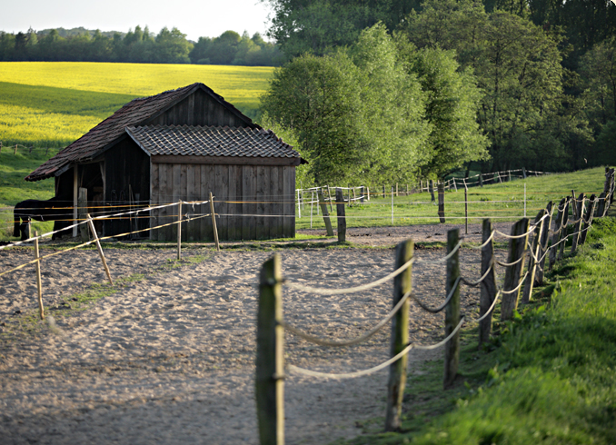 und Reithalfter untergebracht werden. Ein Zuweg aus Kies und eine gepflasterte